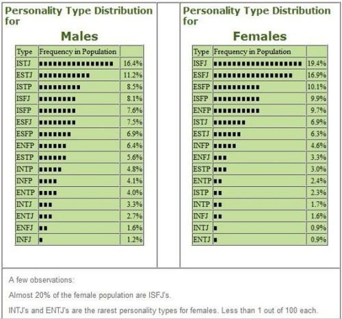 Что думаете насчёт этой статистики? Лично я думаю, что у ж*нщин ISFP и ESFP всё-таки повыше, чем xSFJ, а количество Джечек несправедливо занижено, но вообще выглядит правдиво. У мужчин как-то дебильнее - не может быть такого количества Дюм и Максонов, а Гюгоха распространённее Напа это кек и лол. Джечок опять же где-то внизу, хотя это каждый второй пацанчик с района.