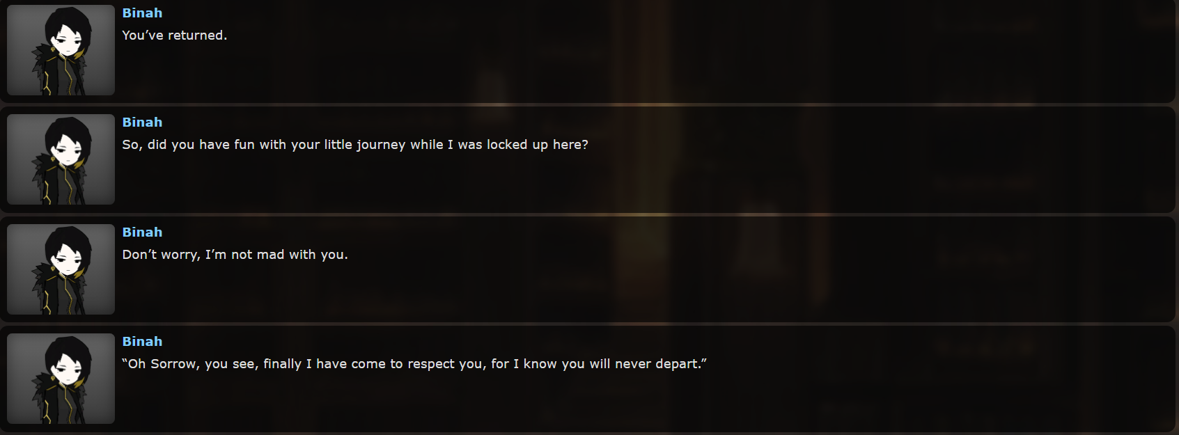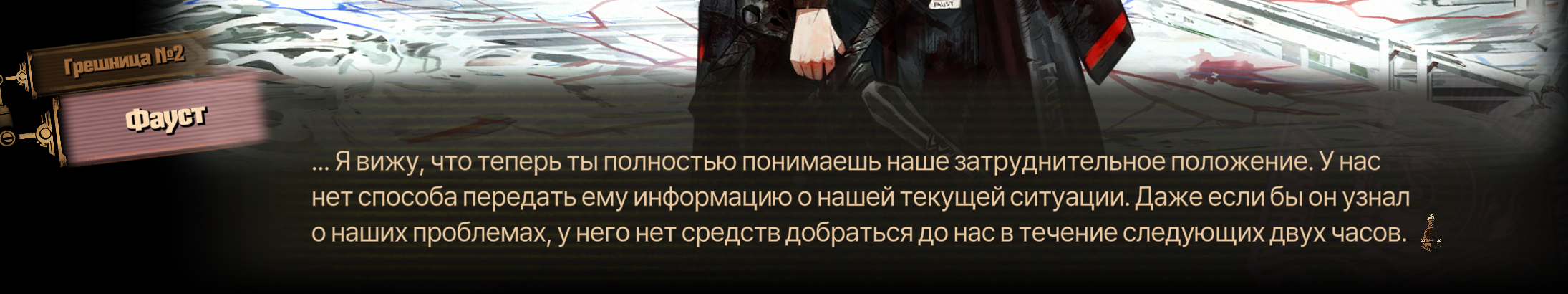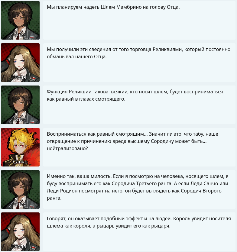 Что все так трясутся от адаптации книжек? Если мы не только через инферно 12 глав пройдём, но и потом ещё по паре кругов, то не удивительно если некоторые сюжетки, как у Дон, Роди и Грегора, ещё будут расширены и продолжены. Просто смысл использовать персонажей книг, если ты напишешь по одной главе-отсылке для каждого, а потом дропнешь книжный материал и начнёшь с нуля? Уверен, что сюжет Родион будет одним из самых важных, учитывая её связь с Юродивыми. Всё это, как водится, сплошной копиум, однако Лигмус от меня денег не просит, так что хуй с ним - терпеливо буду играть до конца всего Инферно, чтобы после раскрытия каждого грешника взглянуть на глобальный замес и решить имеет ли смысл происходящее.