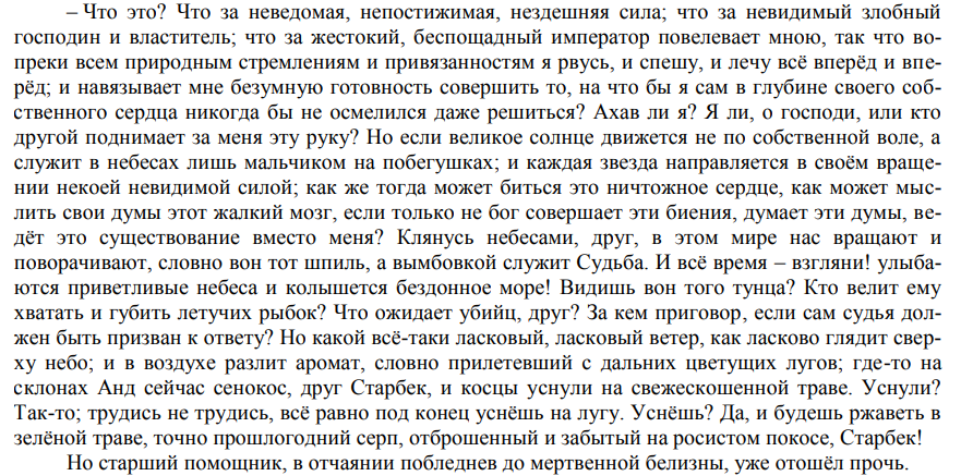 >>4301501 >Под конец он вообще собирался в море один на один с китом остаться, если остальные вернувшись на корабль не смогут починить лодки Что блять? Типо соло? Там еще 6 чуваков в лодке. Ему лоцман дал предсказание о смерти в которое он сам не верил, подсознательно разве что. А вельботы просто разбивали в щепки 2 дня подряд. >Поворота или троллинга тут нет Он определил желание команды идти на кита. Об этом последняя треть книги, и когда единственный колеблющийся персонаж кто видел "обреченную судьбу Пекода" заговорил с ним об этом, тот на мгновение на высоте грот-мачты поведал Старбеку что сущность Капитана детерминирована на погибель от кита. " Ахав остерегись Ахава" - цитирую тебе дураку. Просто максимально идиотский пример приложил, потому что читал жопой. Мог бы банально рассказать про Пипа, как "рациональную" сторону капитана. Или его двух китов на палубе.