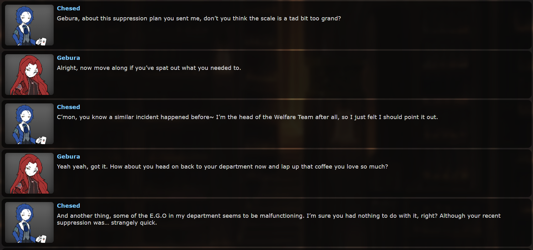 Располагайтесь в своих отделах, доставайте свои книги и заводите Мефистофель, господа. Пожалуйста, обсуждение особо спойлерных тем, таких как [REDACTED] в Лоботомии, [REDACTED] в Библиотеке и данж последней актуальной главы в Лимбусе, прячьте под спойлером, для удобства и комфорта новых агентов. Всем похуй, имейте ввиду.