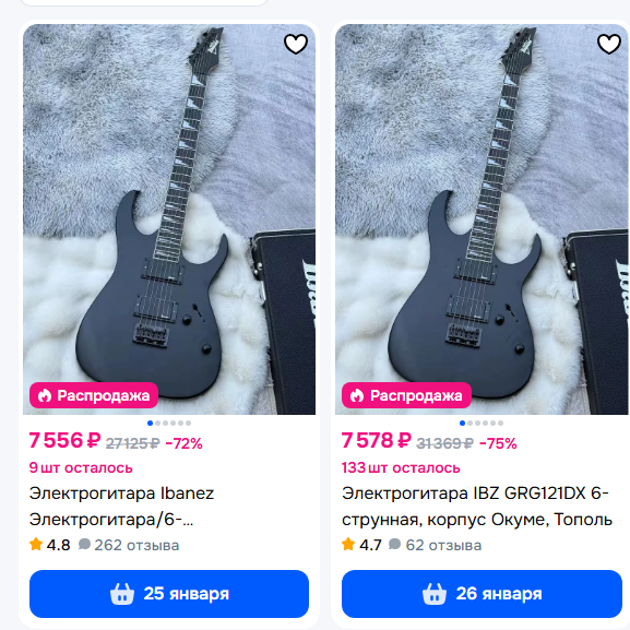 Хочу 24 лада, 2 хамбакера металкор палку. Платить много не хочу. Смотрю на озоне, продают гио ибанез grg121, похуй, подойдет. Но там паль. Первый пикрил точный фейк, накладка слишком черная. Второй, накладка какая нужна, но написали тоже паль.