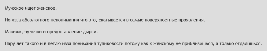 Ну так вот. Как вам фантазия о смене социальных ролей? Условно, можно вспомнить визуальную новеллу FutaDomWorld. Если убрать из неё всякие чисто кумерские элементы вроде нарушающей когнитивные способности спермы, повсеместную гиперфиксацию на сексе и т.д, согласились бы вы исекайнуться туда в своём теле, или даже в предпочитаемом вами мужском теле, вместо превращения в тян в нашем мире? Или если бы в нашем мире тян физиологически стали сильнее, доминантнее, инициативнее мужчин?