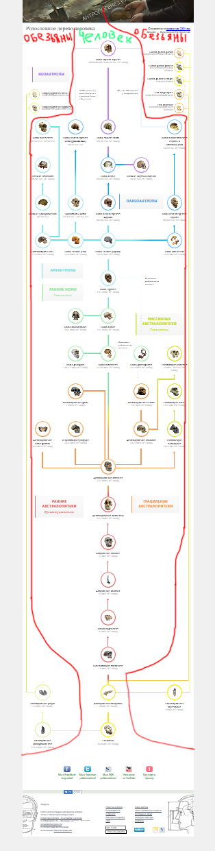 Вот скрин с сайта Антропогенез, главного оплота вученых звероебов в России. Между современными обезьянами и общим человека ЗВЕНЯЩЕЕ НИХУЯ, при этом эволюция человека расписана достаточно подробно. За 15-18 миллионов лет отложений ни одного предка современной обезьяны. Хотите самый просто и реалистичный ответ на вопрос почему так? Потому что все что откапывают записывают в предки человека. Потому что это престижнее.