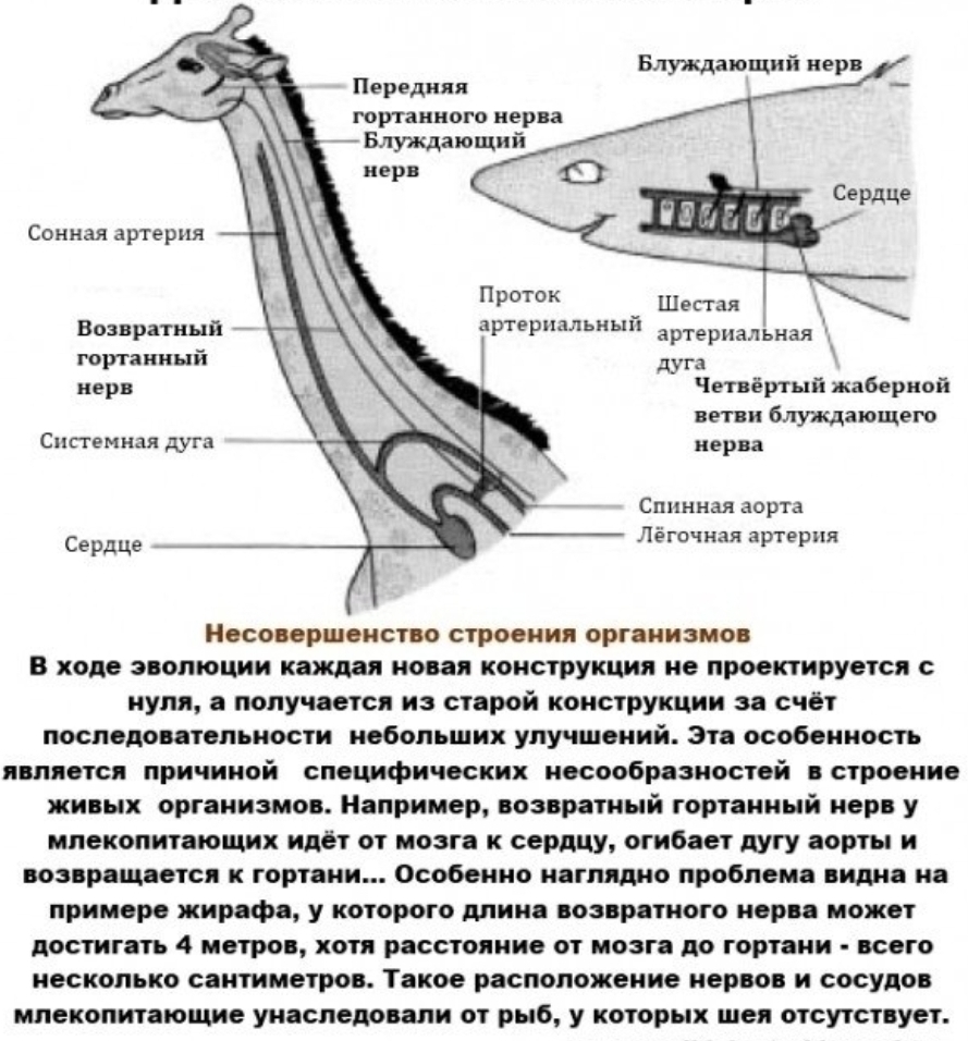 Во вторых разумное нечто никогда бы не сделало у ебаного жирафа возвратный гортанный нерв настолько через очко: возвратный гортанный нерв в идеале должен идти напрямую от мозга к гортани, но изза эволюционного отбора он закрепился через огибание дуги аорты потому что у рыб шеи нет, им такое строение ок, у жирафа жратва на дереве высокого и длинная шея, а строение нерва как у рыбы, что не просто контрпродуктивно а фатально во многих случаях жизни жирафа. То же рыбное строение нерва у тебя, тупая абизяна.