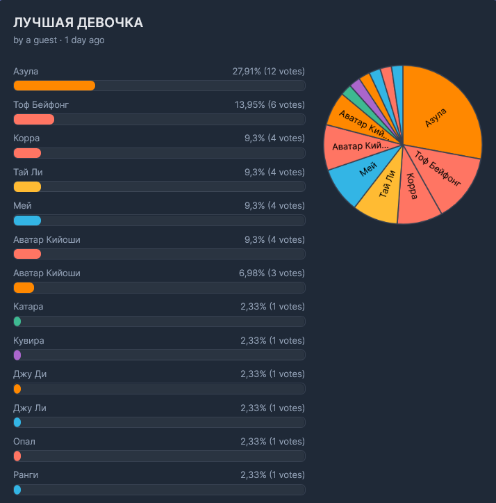 А ведь ты прав, если выставить Тоф против Азулу, но сказать, что если ты голосуешь за Тоф ты ещё и за корру и её дочерей, то Тоф с разгромным счетом победит