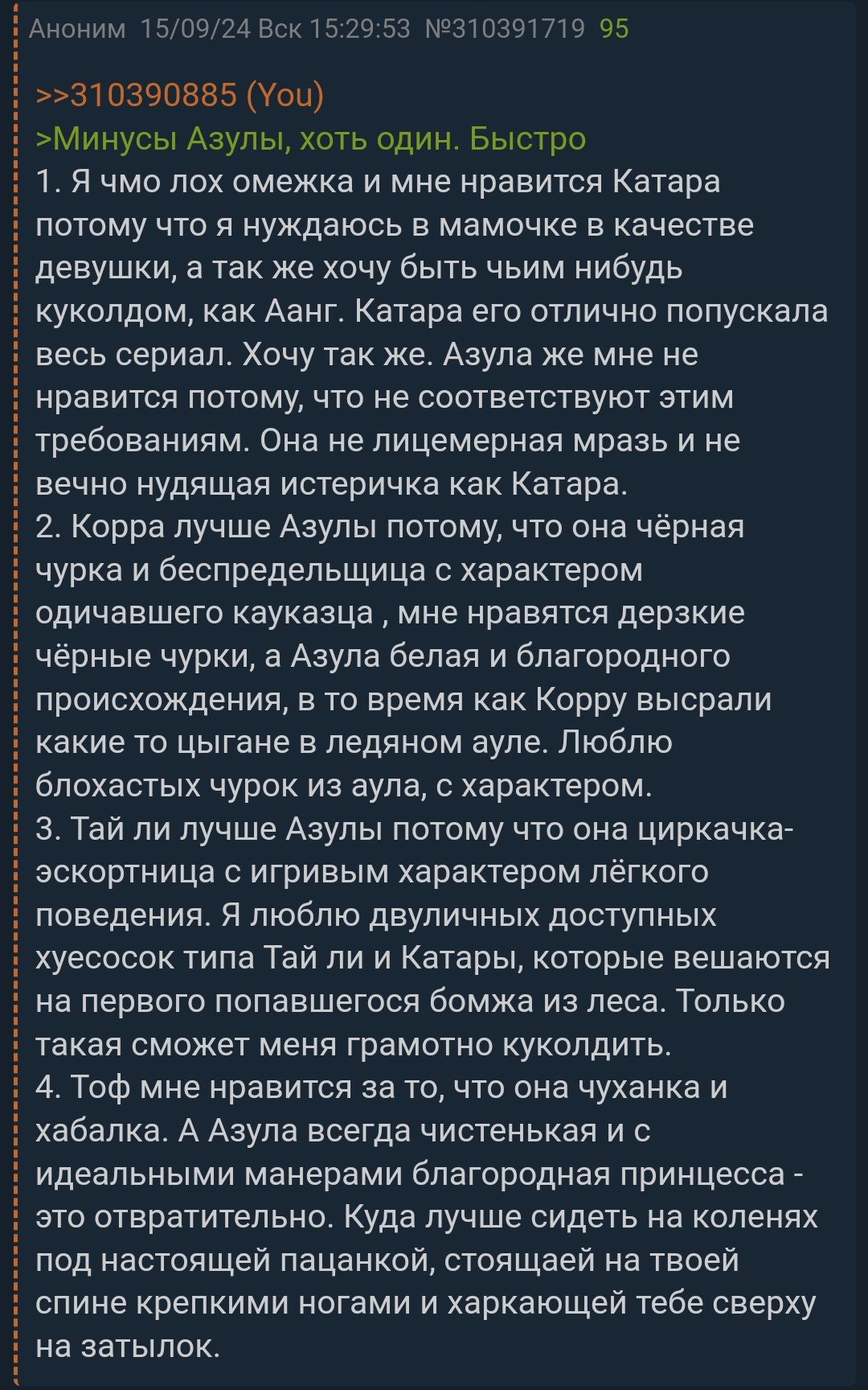 >Поэтому Азула и победила, что любители чуханок не могут определиться,