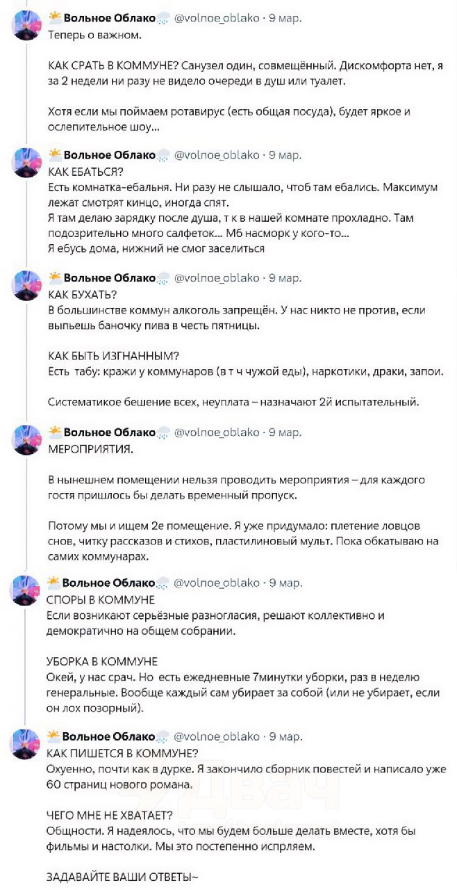 Когда мне было 15 лет, и я ходил в коммуну, коммунар всё время как-бы невзначай крутился возле подвала, и всё спрашивал, что ты там затих, почему тебя не слышно? первый раз я не ответил, так он начал ломиться в дверь, и орать, что ты там молчишь, что с тобой, нарушая горизонтальность в коммуне? начал материться, и говорить, что вообще дверь с петель снимет, алсо, коммунар ругался, если я сру и не смываю, причём не просто вконце срания, а непосредственно после вылезания какашки, мотивировал это тем, что в ебальне потом воняет, и сам потом мне говорил: вот я какну и смываю, и ты так делай! однажды я срать сел, и слышу, коммунар где-то у двери встал в отдалении, а у нас там нельзя шуметь, ну я жопу вытер, и на пол накарачики присел, а там щель очень широкая снизу у двери, ну я в щель и смотрю, а там коммунар на карачиках сидит и в щель смотрит, и мне говорит: ты чё? ебанутый? чё ты там делаешь? коммунар кстати всё время какие-то травы пьёт, чтобы писать книги часто, пишет по 5 раз в день, а потом говорит, что пальцы жжёт, и ещё пердит он, что нарушает тишину. пиздец короче! реальная история. я не тролль