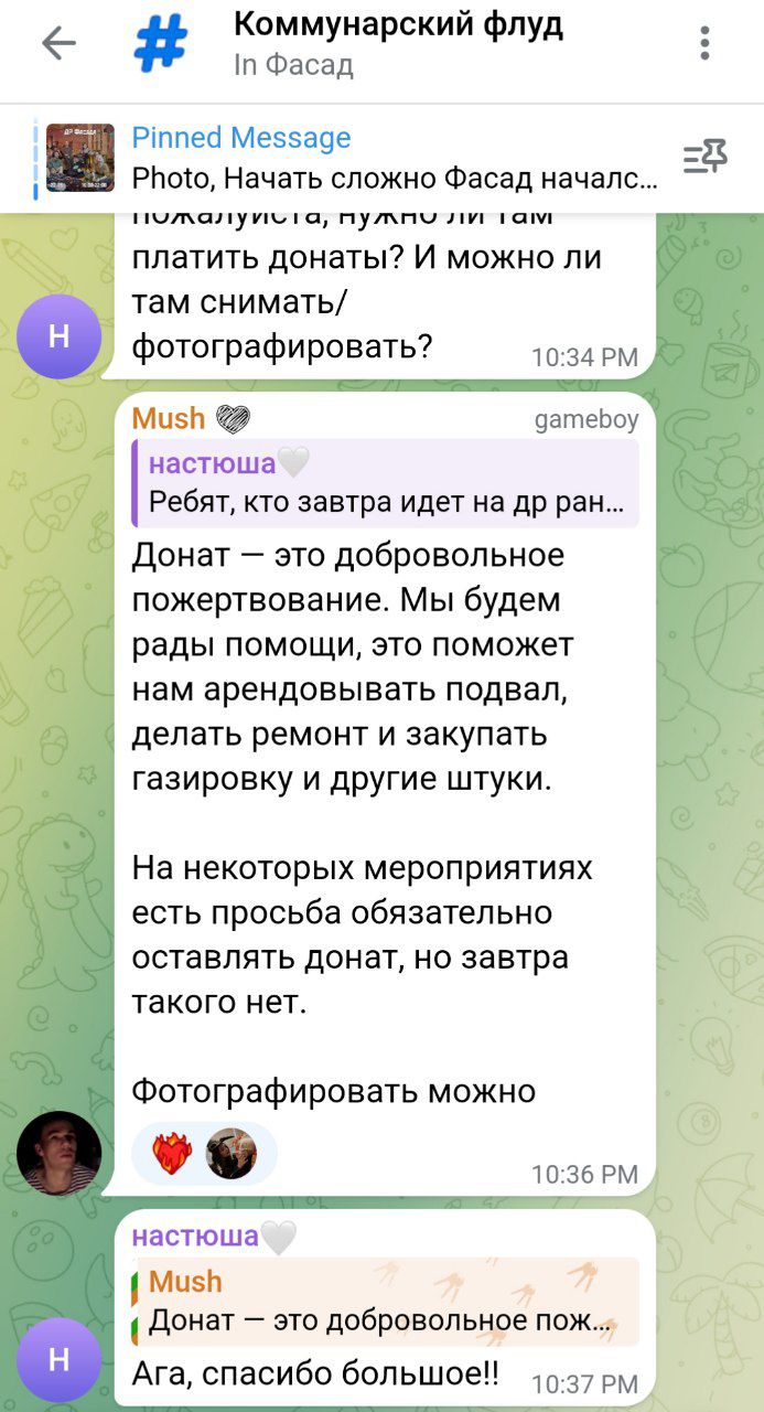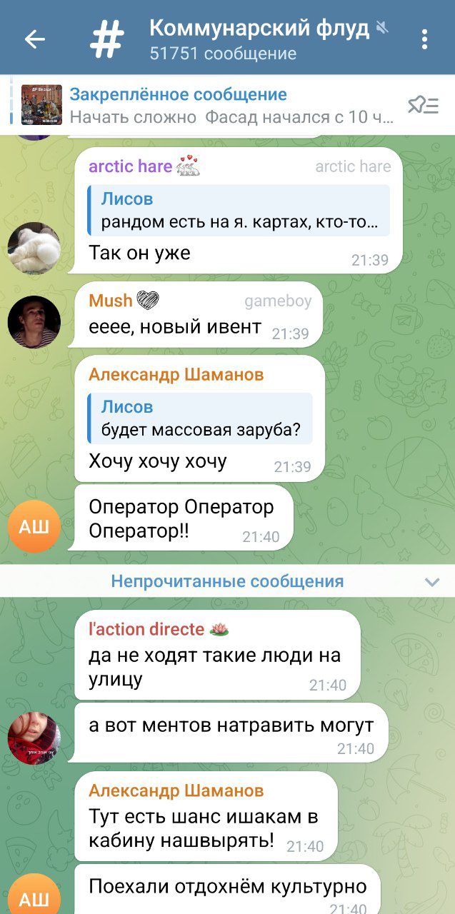 У нас есть общекоммунарский чат-форум «Фасад», чтобы общаться в сети. Чат состоит из нескольких топиков, самые основные — «Важное» и «Коммунарский движ». В «Важном» размещаются только сообщения админов проектов, которые призваны обратить внимание, мобилизировать и направить силы сообщества в важное для сообщества русло. Топик «Коммунарский движ» — флудилка, в которой обсуждают всё о коммунарстве.