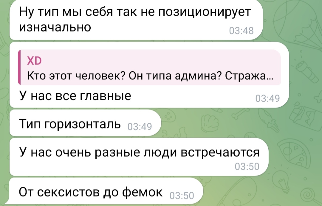 Мне кажется, что пара бегунков из работного дома как-то прилипла к этой коммуналке. Со временем, как самые матёрые долгожители, милостиво взялись надзирать за чистотой параши и устанавливать свои общие правила при мнимой демократии. Например уделять фриганскую еду "на общее". В итоге создали отдельный чат со смотринами кандидатов. И путём товарища Швондера провели уплотнение, чтобы освободить одну комнату под ебальню. Но, по словам нашего синеволосого юнца - в ней вертухаям всё-равно никто не даёт а может это до первой просрочки платежа по аренде?
