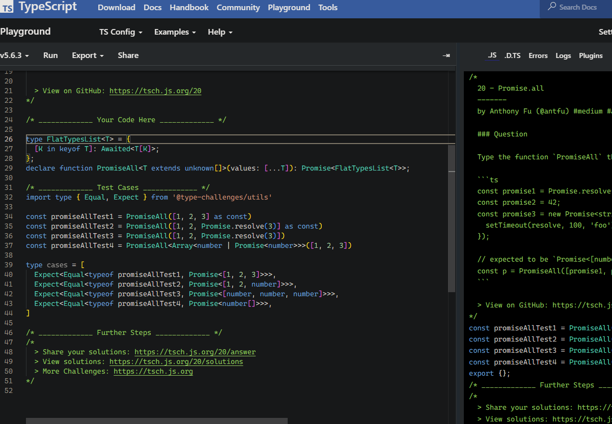 Около часа решал. Разъясните, почему моё решение не проходит тесты на BFE? В TS Playground всё отлично. Версии компилятора разнятся? Что именно не так? Поскольку в плейграунде тесты успешно прошли, засчитаю как решённую.