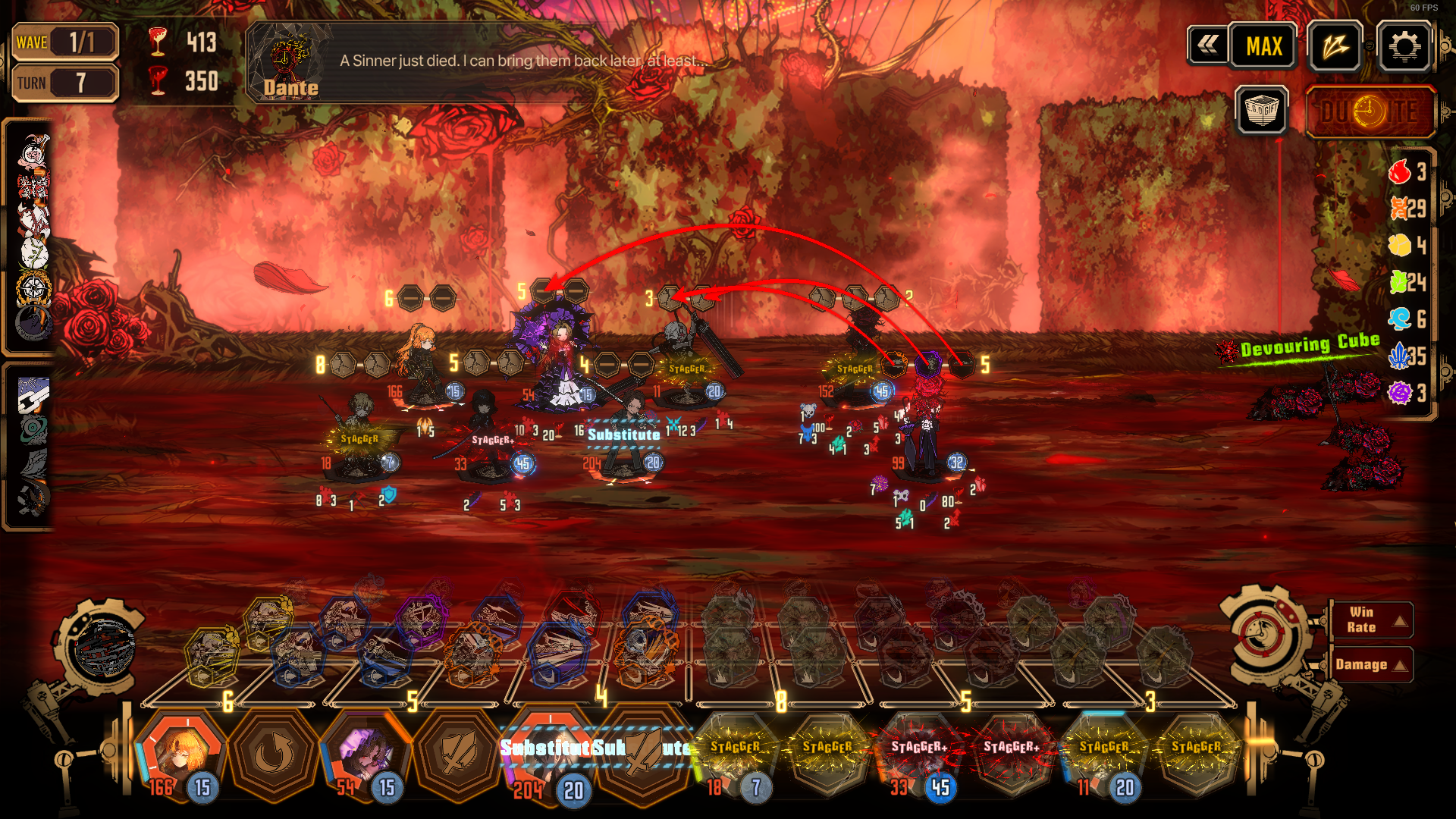 >>4503137 Количество монет = количество атак после клаша и возможное кол-во усиления ролла в клаше/в атаке. После победы ты получал по ебалу либо потому что прилетал другой чужой скилл, либо активировалась контратака противника. Потом ещё будет прилетать от неломаек(красные монеты). Выдача скиллов происходит следующим образом, у тебя есть 3хС1 2хС2 1хС1, которые тебе шансом накидывает в полоску. Вероятнее всего, пул, из которого вытягиваются эти скиллы состоит из двух сетов и пополняется новым сетом, когда будут вытащены скиллы полного сета. Потому тебе может нароллиться 2 С3 в полоску (не одновременно в первый ход) прежде чем выпадет 3хС1. >>4503212 В Фокусед, винрейт собирает полоску будто это анфокусед, не заложена туда оптимизация клашей или раскид стрелочек справа налево. Вообще вероятнее всего винрейт не учитывает практически ничего кроме тира/абстрактного веса скилла, потому что оно мне выбирало клейм зейр боунс при наличии С2 и 45 сп. >>4504022 К сожалению этот бой дизайнился под ограниченное кол-во конкретных идишек, если которых нет на аккаунте - сосёшь хуй. Под АоЕшку обязателен эндюр, т.е. кимсо, прист, дименшон Шреддер хон лю. Пара танков может выжить (к примеру кегклифф под фулл хп и аедд), но только после стаггера, тк на следующий ход там добивающие таргет фиксед атаки которые нужно переклашить. С аоехой клашишь при помощи с3 кимсо, чтобы он не застаггерится. После этого относительно элементарно проходится. Если кого-то не хватает - могу выставить.