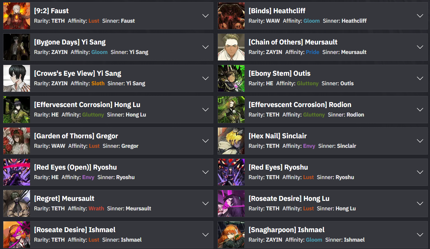Сайт, который пытается быть полноценной датабазой по лигмусу, удобнее игры для впитывания объективной информации по игре, но гайды, тирлисты и субъективщину там пишут какие-то тормознутые чертилы, которые нихуя ни в чём не разбираются: https://www.prydwen.gg/limbus-company/identities/