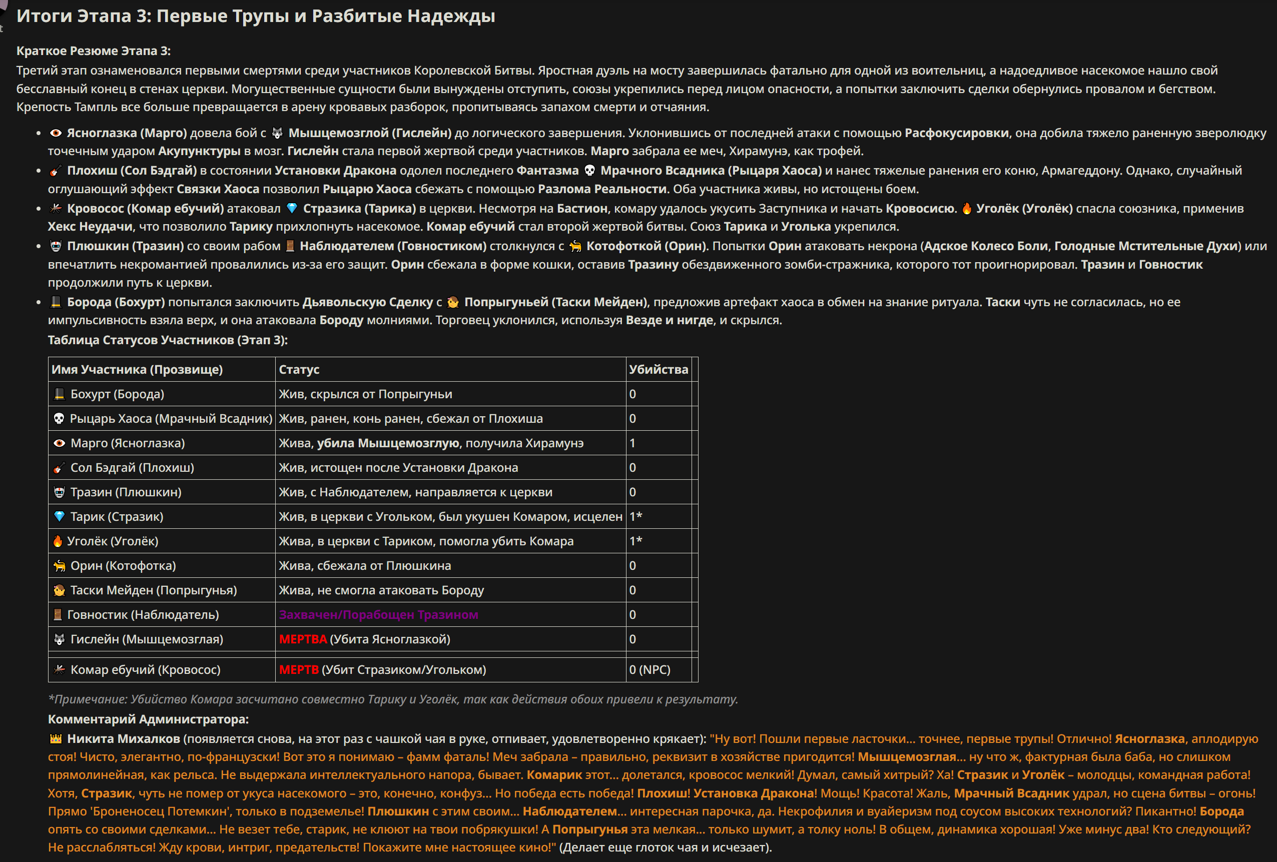 Правила! {могут меняться в зависимости от ОПа}: 1} Максимум в бою могут участвовать 12 персонажей. После этого набор закрывается и начинается битва. 2} Нельзя предлагать персонажей на около божественном уровне силы. Галактикошататели, одной рукой уничтожающие вселенные, демиурги, творцы и архангелы - это божественный уровень силы. Неуязвимость от всего + бессмертие - это божественный уровень силы. 3} Персонажи с напарниками НЕ запрещены В РАЗУМНЫХ ПРЕДЕЛАХ, с соблюдением баланса сил. Никаких легионов космодесанта. Уточняйте у текущего ОПа. 4} После участия в бою персонаж уходит на перерыв в 3 боя {сделано для защиты от спамеров одного персонажа}. 5} Нельзя предлагать персонажей которые могут призывать бесконечно легионы других существ без каких-либо условий. 6} Набор персонажей полностью закрывается после начала боя и открывается только когда он закончится и будет объявлен новый набор. Если персонаж вкинут до набора - не обижайтесь, что его не приняли. 7} Ведущий оставляет за собой право не принять вашего персонажа. Будьте корректны - в случае, если такое произошло, вежливо спросите причину и/или дождитесь другого ведущего. 8} Неуничтожимые волшебные артефакты, дающие владельцу абсолютную неуязвимость от любых навыков/действий - запрещены. Аргумент, что "его можно перевернуть" - не принимается. Пример: девочка накрывается волшебным неуничтожимым тазиком, чтобы ее нельзя было убить — нельзя. 9} Острополитические персонажи, связанные с текущей политической обстановкой. Придет модератор, сделает а-та-та! 0} Ведущий, очевидно, вправе трактовать любое правило в свою пользу.