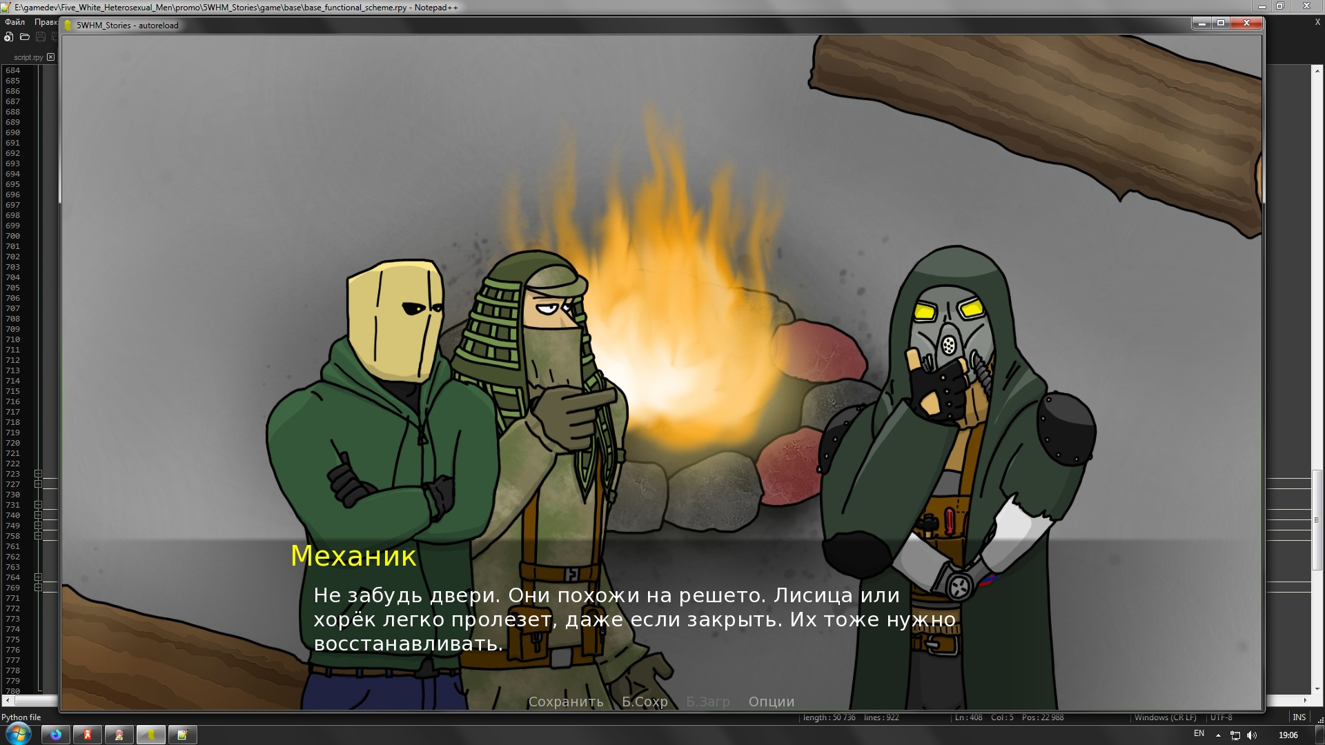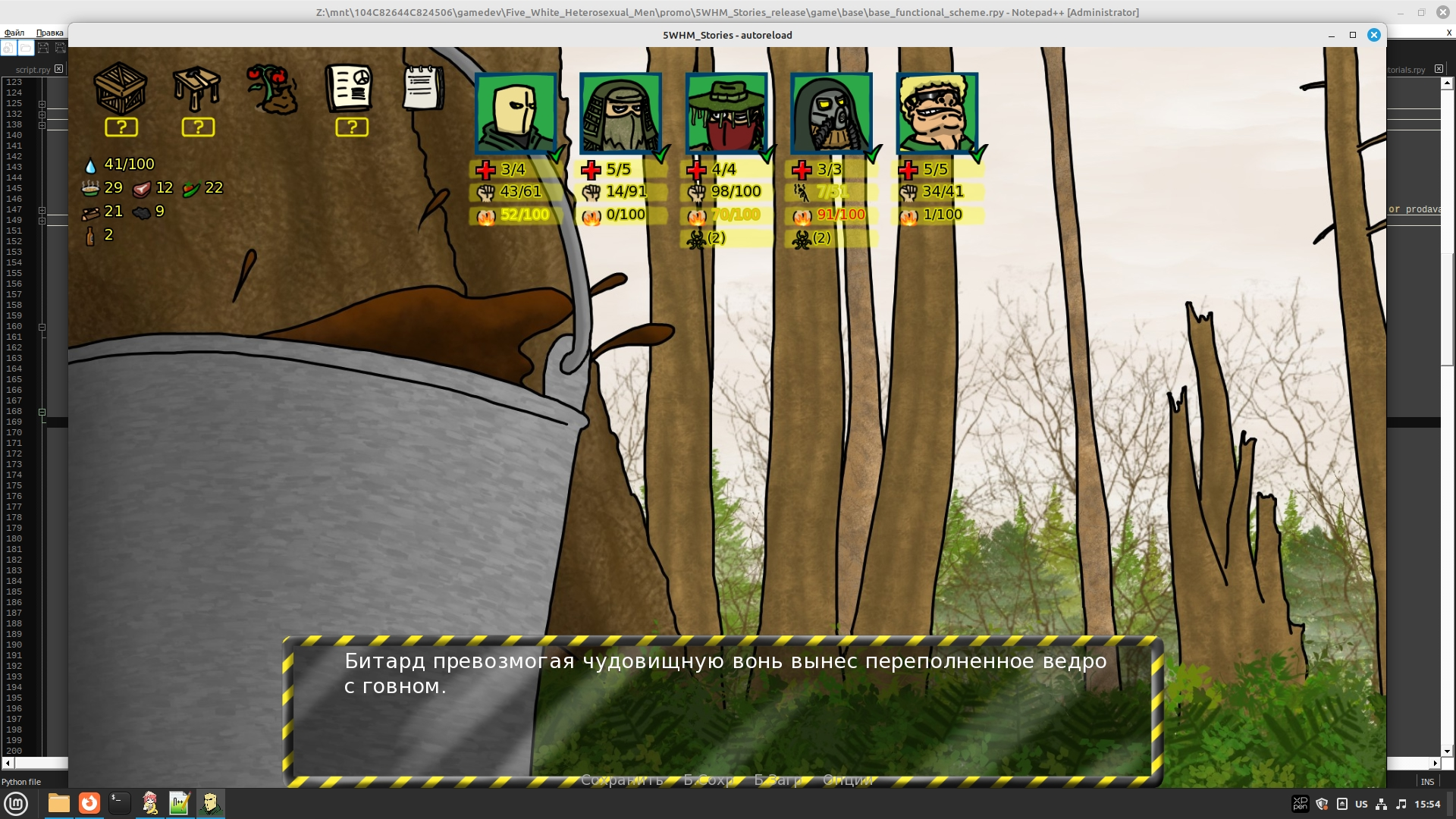 Короче, пилится на Ren'Py гибрид стратегии и ВНки. Про то, как мир был захвачен СЖВ-Диктатом, и волею судеб вынесенные в название игры пять белых гетеросексуальных мужиков, изначально просто свалившие в глушь из всяких гетто, чтоб выживать потихоньку - оказываются втянуты в противостояние. И ни СЖВ-патрули, ни боевые пидарасы со своими факин слейвами, ни боевые куколды и прочие прихлебатели толерастские их не остановят!