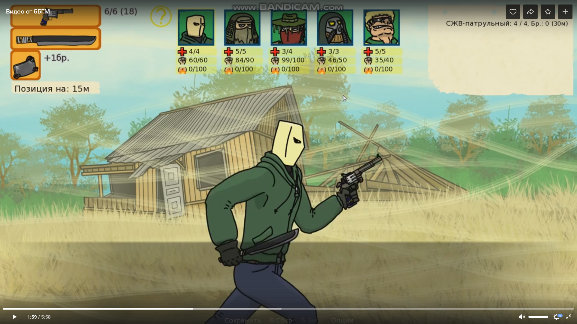 В наличии есть боевая система (по сюжету - будет улучшение снаряги, с соответствующим отображением на персонажах в бою), анимированные спрайты персонажей и врагов для боя, развитие своего выживаторско-партизанского быта, постепенная прокачка персонажей, а также упоротый и ебанутый сюжет!