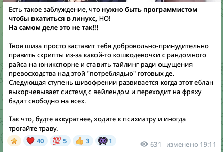 >>3684777 Пост довольно типичный для русскоязычных Linux-форумов/чатов/тредов уже лет 15–18, ничего особо нового или глубокого там нет. Это классический holy war между "Debian — для настоящих" и "Ubuntu — для нубов/ленивых".
