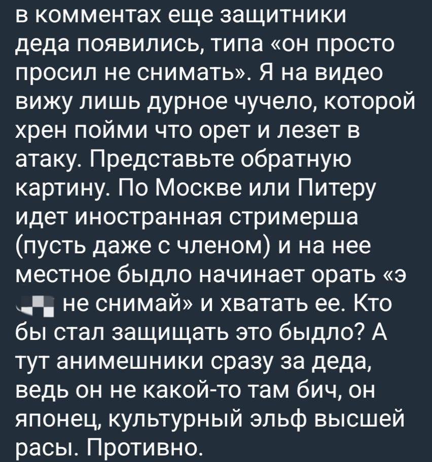 Пидор приехал в японию насмотревшись аниме и на волне хайпа, хайповал перед пидорасами со своего стрима. Но японский дед базовичок показал, что этому пидору здесь не рады. Надеюсь его депортируют, оштрафуют и закроют въезд в японию на всю жизнь, что этот пидорас вскроется.