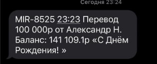 >>4640613 Хех, мне мамка тоже сегодня на др деньги прислала 5000р. Я ей говорю каждый раз, мать, я успешный наносек, порой по пол-ляма в месяц зарабатываю, давай лучше я тебе денег отправлю, дом отремонтируешь. Нет, говорит, мне ничего не надо, вот тебе хочу подарок сделать. Ну ладно.