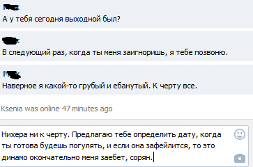 У меня такая же история как и у опа. Познакомился на флаймере с няшей-стесняшей. 4 раза погуляли, хотел еще раз позвать и наконец взять ее за руку и поцеловать. Написал ей, а она больше не отвечает. Даже мои сообщения не читает. Причем это произошло после того, как она на посвят съездила. Целую неделю из-за этого убивался. Недавно к шлюхе сходил - вроде отпустило, сейчас новые поиски начал