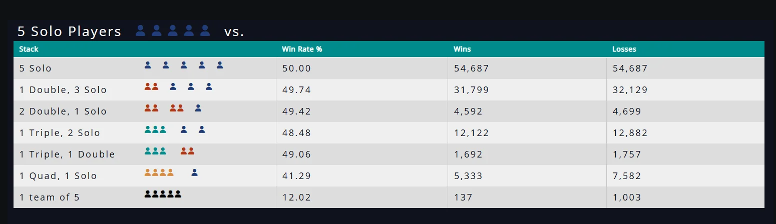 >>50370234 Наверно ты не совсем понял стату, в ней указано что 5 соло игроков против фулл пати имеет всего лишь 12% винрейта, следовательно пати ебет одиночек сильно