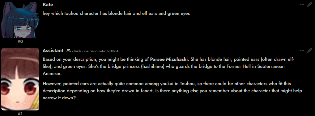 >>1231216 > OpenRouter behaves differently. By default, SillyTavern sends your prompts to OR Claude as-is, with the system roles intact, and OpenRouter subsequently moves them up to be next to the rest of the system prompts at the top, above any user/assistant prompts, before forwarding them to Claude. This means that your system role post-history prompt actually ends up being sent before the chat history, which is obviously not ideal. хотя погоди. из этого следует что итоговое системное сообщение юзабельно? т.е получится что-то типа: System: . . . . (твоя системная простыня)