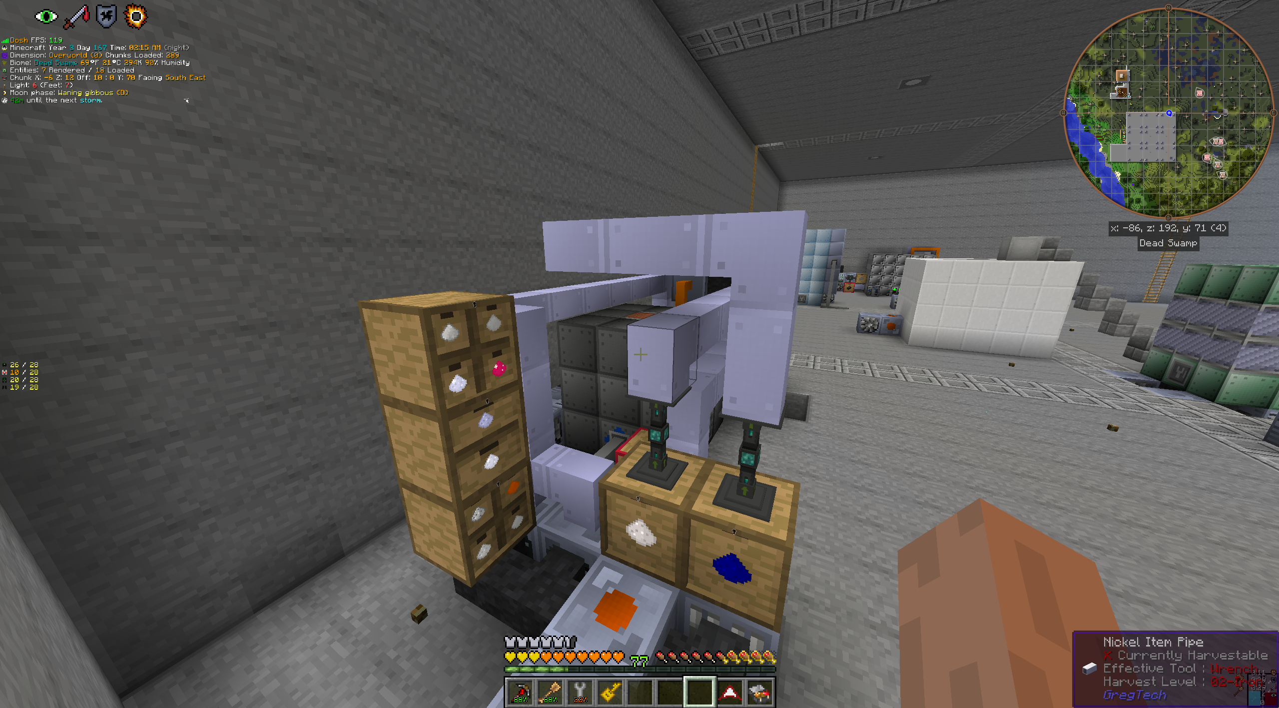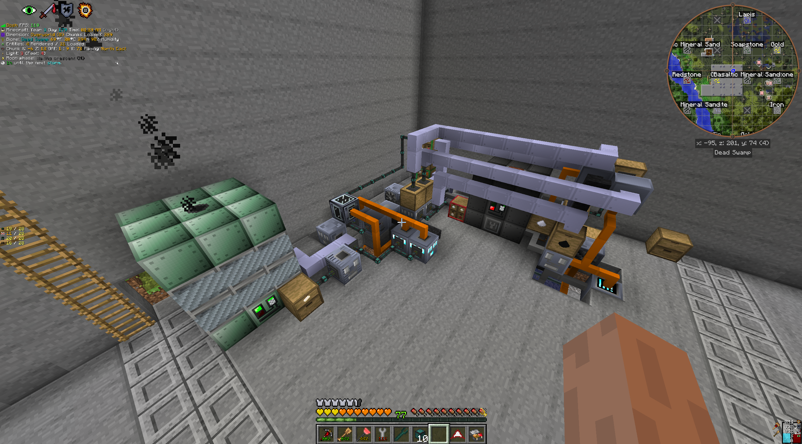 Очередной закат, теперь на 2.7.4 + обновил NEI до функции автокрафта из избранного. Прошлая попытка была на сервере, начал делать платлинию, забуксовался и дропнул. Т.к. в гречу я стартовал уже с десяток раз и это сингл, поэтому врубил пока мирный режим, базовые жилы искал сканером пушо я заебался уже эти дырки в чанках хуярить, плюс тп по меткам на карте. Базу отстрою и врублю хардкор обратно.