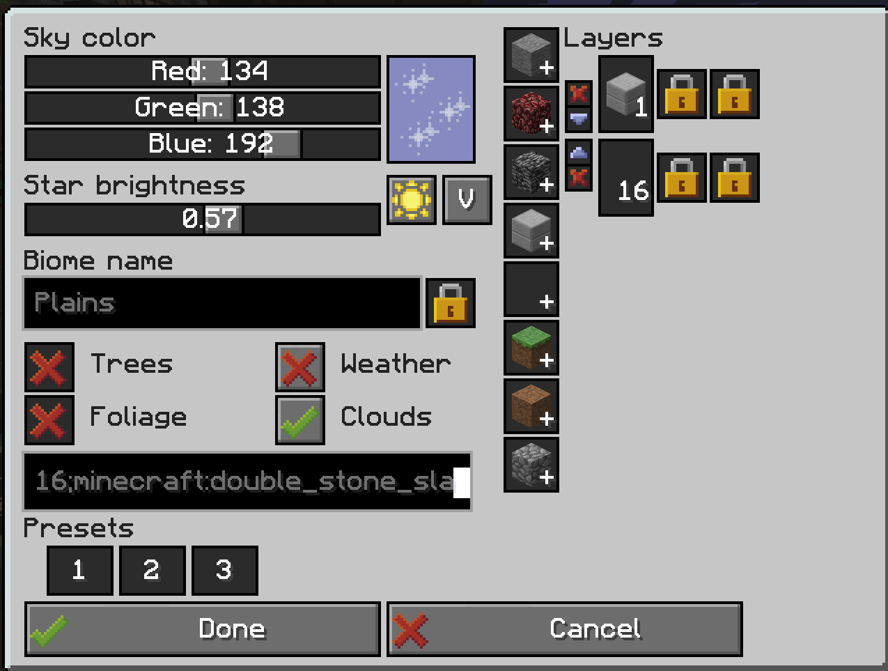 >>615425 Эт турбина ебнула, причем причину баха так и не понял. Там основная проблема в ебаном квантовом мосту, который память переполняет. Из-за этого я снес всю п2п хуйню в оверворлде и теперь пора подключать все снова. Насчет личного дименшона хуй знает, у меня вот так стоит. Думал что один слой все же нужен, но на самом деле лучше полный воид. Так проще. На биом мне похую в целом, для пчел есть адаптеры по этим параметрам, а растения я уж так не оптимизирую жестко.