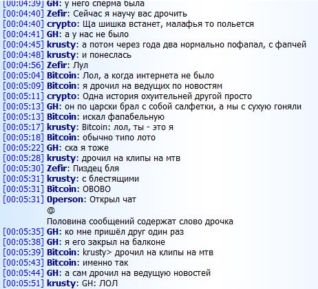 Бомбит от того, с каким быдлом я учусь. Ну ладно бы батя таким был - это еще понятно было, человек из деревни, придерживается традиций "учись-работай-семья-машина". А тут молодые люди, неплохо шарящие в компах. Люди, которые по идее должны иметь гибкий ум и способности к абстрактному мышлению. Я им, блядь, пытаюсь рассказать про битки на примере условных фантиков и хитрых евреев, а они ни в какую. Все аргументы - "нивазможно, наебос, нивидись". Я им говорю, что как-то слишком уж много развелось говносайтов и прочей шелухи для того, чтобы это было обычным наебом, а они мне то же самое - "нивазможно, наебос, нивидись". Еще и смеются при этом, как будто я уже заложил квартиру и живу на вокзале в ожидании очередного взлета битков.