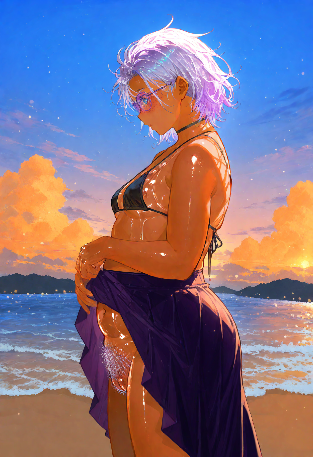 Negative prompt: deformed, mutated, ugly, disfigured, long body, lowres, bad anatomy, (bad hands, missing fingers, extra digit, fused fingers, fewer digits:2), cropped, very displeasing, (worst quality, bad quality:1.2), bad anatomy, sketch, jpeg artifacts, (signature, watermark, username, text, patreon logo, artist logo:2), simple background, muscular female, abs, large breasts, huge breasts, shiny skin, shiny hair,