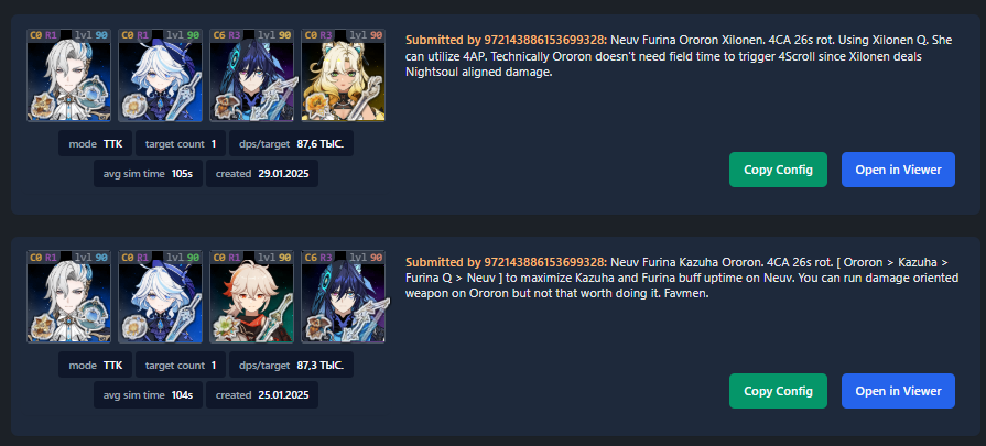 ✦ Калькуляторы урона https://genshin.aspirine.su/ ∙ https://frzyc.github.io/genshin-optimizer/ ∙ https://teucerdev.github.io/little-bro/ ∙ https://gcsim.app/