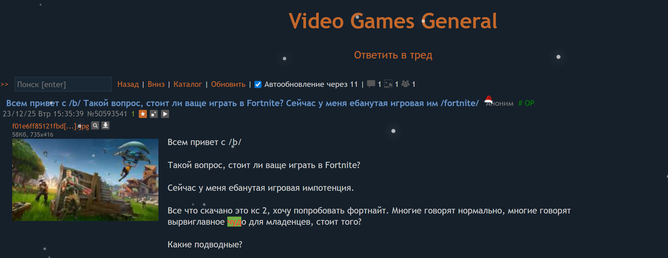 >>49937128 Ладно, отчасти беру свои слова обратно, вот несколько дней побегал, всё ещё в душе не ебу что за куча режимов в игре, тупо регаю нулевой уровень и даже не собираюсь разбираться чё там в других режимах. Ну разве что вчера весь вечер ебенил в блиц, очень уж понравился режим, плюс скин залутал свой первый. И мне прям фортнайт начал заходить, 90% игр приносят удовольствие даже если не беру первое место, кайфую как от стрельбы так и от перемещения даже. Вчера ещё попробовал пабг, подумал мб я принял для тебя батл рояли, но после первой же игры удалил, душнина ебаная, вот думаю варзон попробовать ещё.