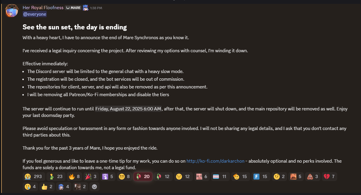 @everyone See the sun set, the day is ending, With a heavy heart, I have to announce the end of Mare Synchronos as you know it.