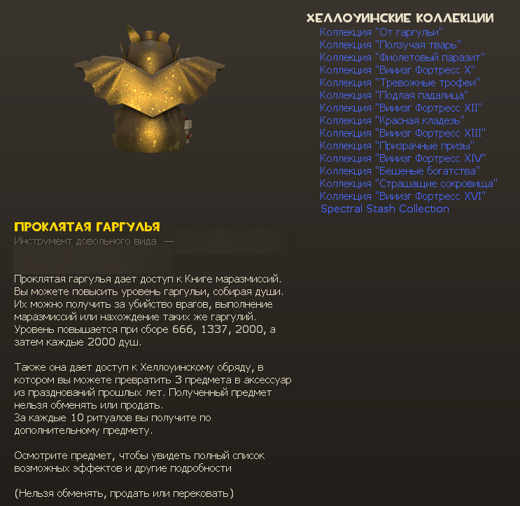 Все игроки, которые запустят игру, получат Проклятую гаргулью, если у них ее еще нет. Предоставляет доступ к Маразмиссиям и трансмутациям предметов Хэллоуина. Отслеживает завершенные Маразмиссии и собранные души.