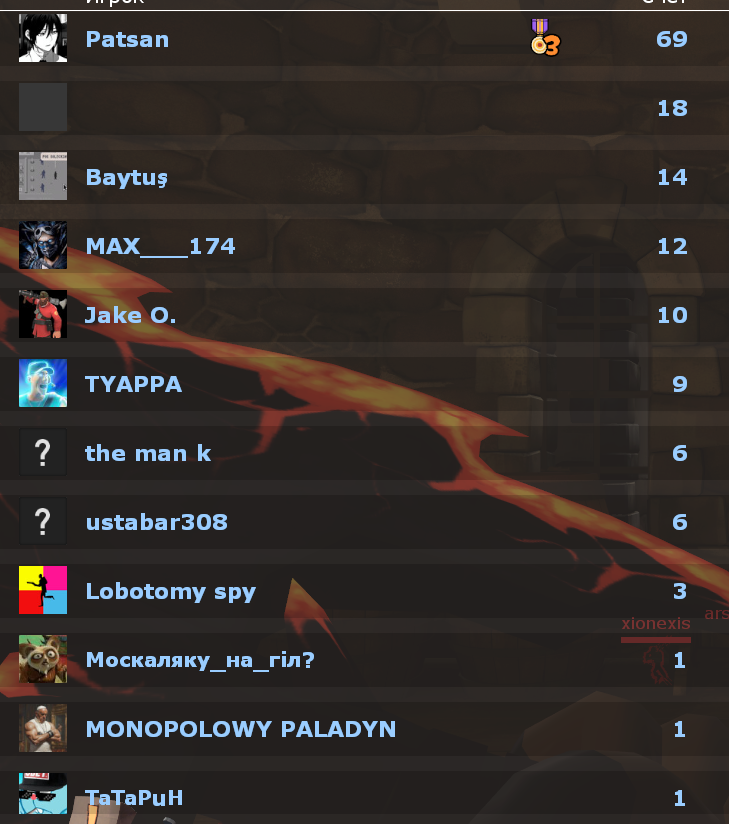 >>50330388 Играл год назад. Ну типо играют одни и те же люди. Видишь ники, знаешь у кого будет спай задрот всех вырезать, у кого солдат задрот с прямым попаданием жонглировать и ебать, у кого будет ебучий неубиваемый скаут.