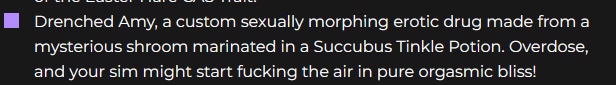 >>49891748 Мод чисто для отыгрыша, если очень надо угареть по ссанине и проч. Разговоры на соотвествующую тематику у симов с фетишами накидывает им мудлет похоти, который упрощает их соблазнение. Хотя, затащить незнакомого сима в койку и ваниле делов на пару кликов. Пары фетишей-трейтов прям сразу совпадают, и можно в койку тащить, сказав "привет".