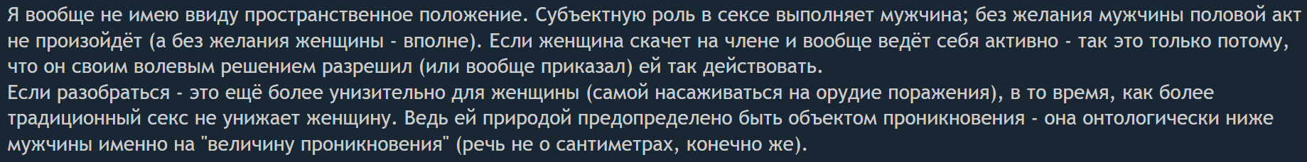 Местные шизы дошли куда дальше, по понятиям женщина не считается грязной (если не сосала, но и мужик оизавший аналогично) в отличии от пидора. Шизички же решили что и обычный секс уже унижает женщин