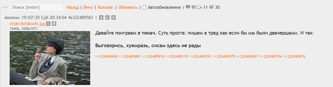 Если бы бедобашковые подстилки не выискивали олегов под кроватью, я бы не деанонилась. Просто иногда мои тейки реально можно понять неправильно, ну например касательно моей позиции по поводу самоходства. Может создаться впечатление, что я чушок, который это пропагандирует чтобы ему давали секс. А я на самом деле просто бомблю из за традвайф мизогинок, которые используют слатшейминг и пропагандируют необходимость брака. По тредам можно было заметить, что я начинаю эти срачи в ответ на посты, где всякие жопорихи оскорбляли и унижали женщин. Вот и все. Против кннщиц я же ничего против не имею и не говорю что они должны пойти ебаться с кем попало. Наоборот я говорю,что это круто, молодцы. Кнн это самый лучший выбор. Поэтому я чувствовала необходимость доказать мою половую принадлежность, чтобы моя позиция не искажалась в глазах читателей.