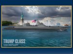 >Флот США представил проект нового линкора класса Trump. 12 ПУ Conventional Prompt Strike (CPS), 128 вертикальных пусковых установок VLS, лазеры мощностью 300 или 600 кВт, рельсовая пушка мощностью 32 мегаджоуля. Экипаж 650-850 человек. Газотурбинная/дизельная силовая установка, длина 840-880 футов (256-268 м), водоизмещение 35000 тонн.