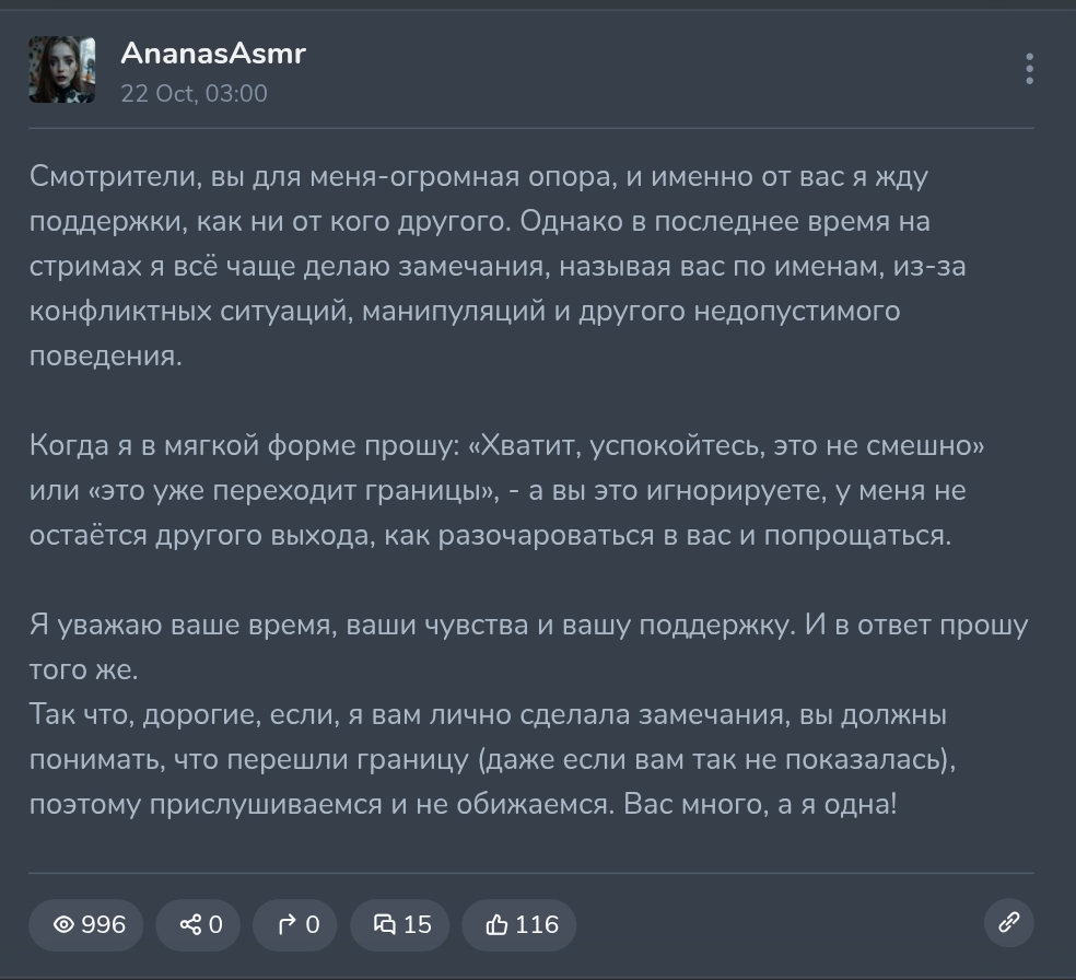 Оставлю лишь одно напутствие для симпов. Вам ничего не светит. Вы лишь одни из сотни денежных кошельков. Вам будет приятненько на какое-то время, но все равно вы не построите отношения глубже, чем случайные знакомые. Лучше найдите девушку, потратьте денег для близких, да просто шлюху снимите, за те же бабки она даст вам гораздо больше любви, внимания и тепла чем ананасовое притворство.