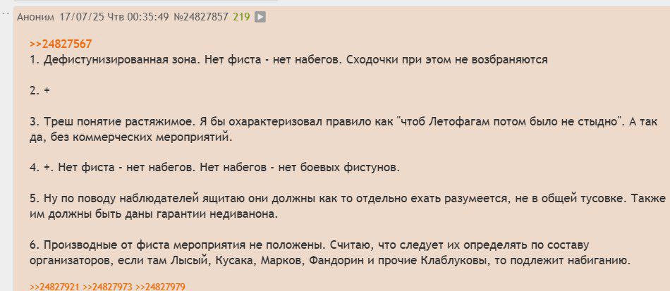 · НАБЕГ НУЖЕН НЕ ДЛЯ ТОГО, ЧТОБЫ УСТРАИВАТЬ УЛЬТРАНАСИЛИЕ ПРОТИВ ФИСТУНОВ, ОРГОВ И КОСПЛЕЕРШ. ПРИЗЫВАЕМ ГНАТЬ ССАНЫМИ ТРЯПКАМИ ЛЮБОГО, КТО ПРИЗЫВАЕТ К НАСИЛИЮ ПРОТИВ УЧАСТНИКОВ ФИСТА, СОТРУДНИКОВ ЛАГЕРЯ, МИМОКРОКОВ И Т.Д.