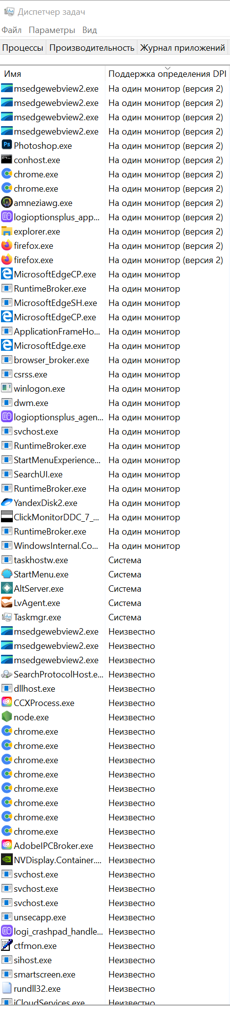Те приложения, которые Per-Monitor v1 в Диспетчере задач (например на скриншоте Яндекс.Диск) при перетаскивании на другой моник вообще не подстраиваются - то есть окно стало здоровенным на монике со 100% масштабом при перетаскивании с моника с большим DPI.