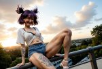 1girl, solo, <lora:drakopalustra:0.8> drakopa, furry female, purple eyes, <lora:Hoseki_ZenlessZoneZero_Vivian_IllustriousXL_v1:0.8> v1v1an, pointy ears, mole under eye, multicolored hair, purple hair, white hair, streaked hair, ahoge, swept bangs, drill hair, drill sidelocks, long hair || two-tone hairband, black hairband, purple hairband, purple hair bow, Sports shorts, short shirt, 2 strips on clothes, navel, Adidas clothes , high angle, perspective, V, car