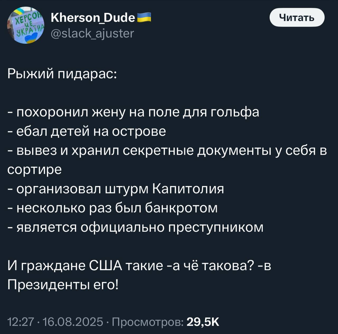 >>25019610 >>25019619 Увидел это в местных новостях: An insider close to the White House has revealed some of the points discussed by the presidents at the Anchorage summit. In one of the public points of agreement regarding humanitarian goals, one of the mandatory conditions set by Donald Trump was mentioned, namely, the expulsion of a certain Ilya Maddison back to Russia. A direct quote: "He's not a smart guy, and we don't need him here."