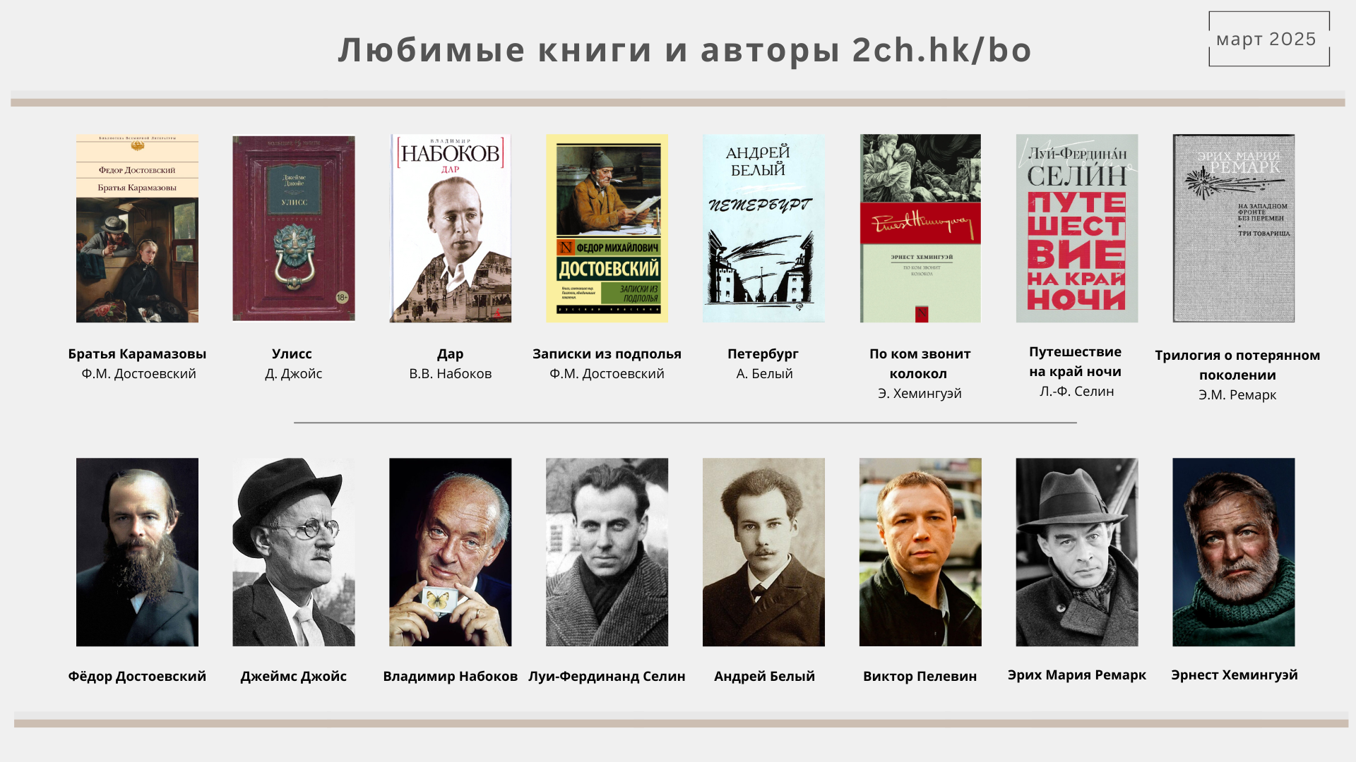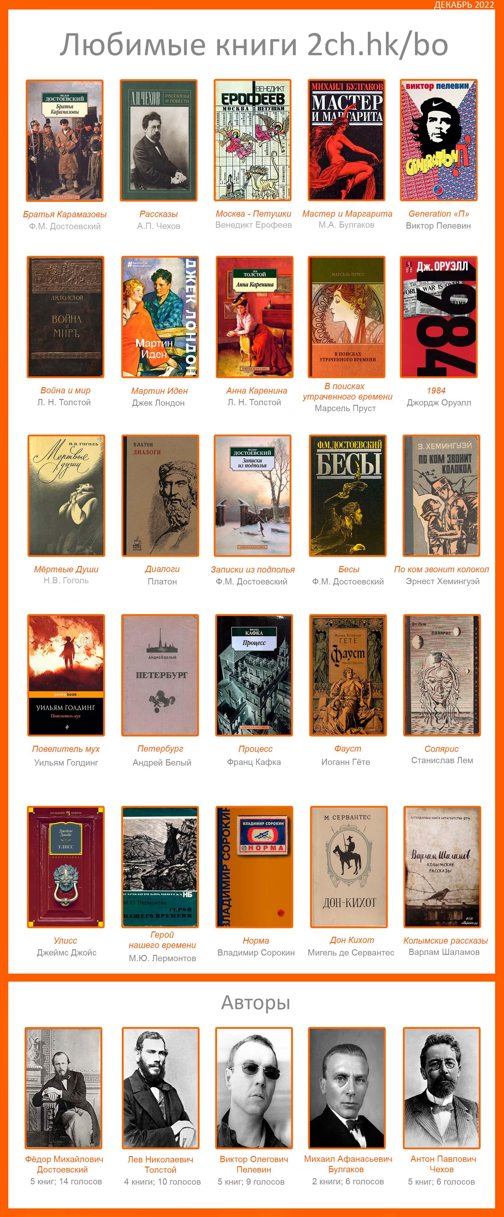 Есть ли такой топ лист книг, но только не с западных этих ваших интернетов, а с местным колоритом, с акцентом на местных обитателей имиджборд? Типа с Мамлеевым, Сорокиным и т.п. У каждого второго вижу их. Скидывайте пж. Если такого нет, то стоило бы создать.