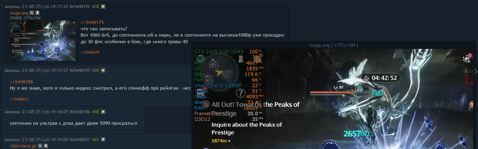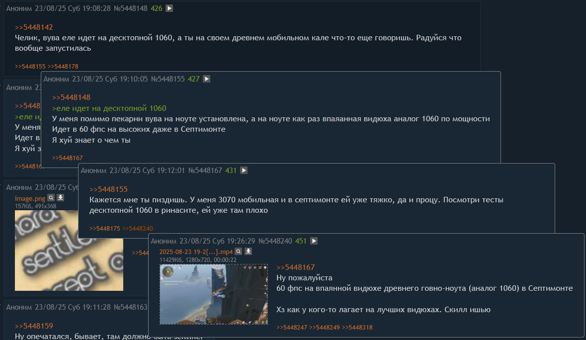 >>5456525 > Прекрасно тянет без фризов 1280x720 на средних? Или просто рендер скейл открутил до 0.5? Ну и нахуй такая игра нужна? Я сам сидел на 1050ти во времена конца иназумы и начала сумеру. И если ещё в 2.8 в фхд на максималках 1050ти пердела, но выдавала 60фпс на пределе своих возможностей, то 3.0 её убил окончательно.
