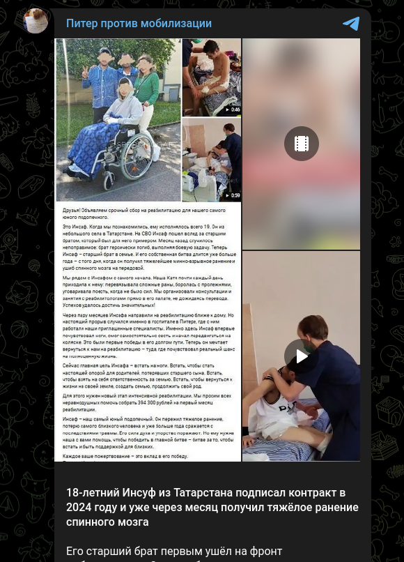 18-летний Инсуф из Татарстана подписал контракт в 2024 году и уже через месяц получил тяжёлое ранение спинного мозга
