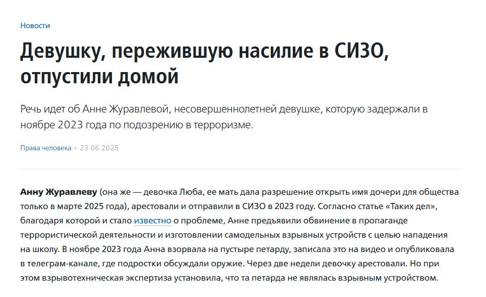 По 14-ти летней девочке (сейчас её уже 16 лет) которую за взрыв петарды на пустыре и глупую переписку в закрытом телеграмм канале где она вероятно в силу своего возраста не понимала последствий обсуждаемых ею тем и призывов нарушающих закон, из за чего произошел арест и потеря двух лет детской жизни в СИЗО и психушке , где её каждый день насиловали, а сотрудники СИЗО и прокуратуры с СК игнорировали её заявления и заявления её мамы я тебе ссылок накидаю, что то просочилось в СМИ.