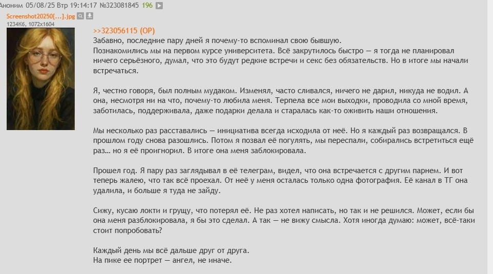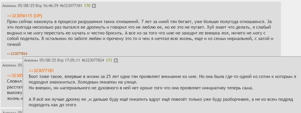 Но я не простил ее даже спустя 3 года отношений. Это все еще саднит. И вот я все думал сделать зеркалочку, но блять откуда мне подруг найти, когда я впахиваю на заводе 6 дней в неделю. Потом я с завода уволился и думаю, что как будто бы одна измена с моей стороны может сравнять наши счеты и я буду спокоен. Короче, я не могу ее бросить, потому что она не какая-то очередняра с улицы, а тянка которая любит меня так, как никто не любил. Поэтому как будто остается только отомстить ей.