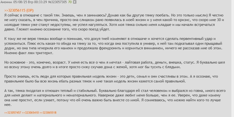 Я понимаю, что это рационализация, но я в данном случае считаю измену каким-то благим делом, которое нужно сделать, чтобы дальше спокойно вести отношач. При этом если бы тянка мне не пиздела и не предавала, я бы ей ноги до конца жизни целовал, мне нахуй интереснее в компик посидеть погамать нежели с кем-то там мутить или шлюх искать, а секса мне и от тянки хватает.