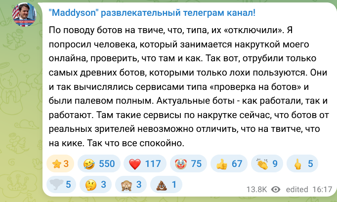 Особенно пострадали стримеры из агентств и стримерских объединений — подметил xQc. Он предположил, что агентства манипулировали алгоритмами платформы с помощью ботов, увеличивая просмотры своих подопечных и тем самым завышая стоимость рекламных контрактов.